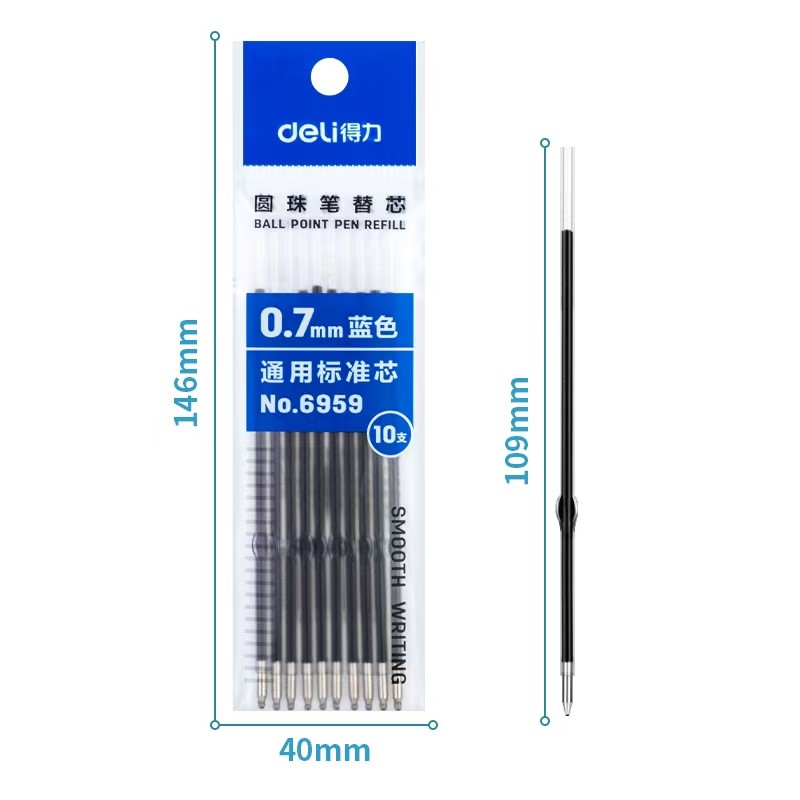 得力6959圆珠笔芯0.7mm子弹头(蓝)10支